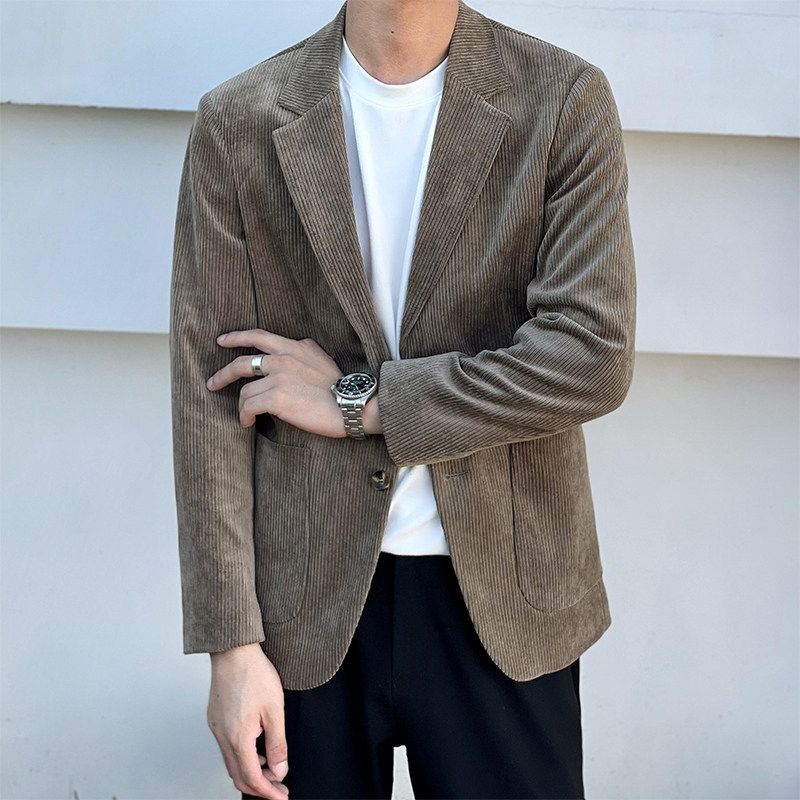 禾沐男装2021秋季新品灯芯绒素条商务休闲两粒单排扣纯色西服上衣热门设计联盟服务商