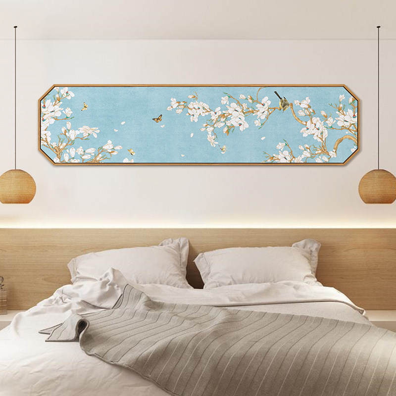 新中式床头横幅装饰画客厅沙发背景墙卧室墙面挂画八边形花鸟壁画热门设计联盟服务商
