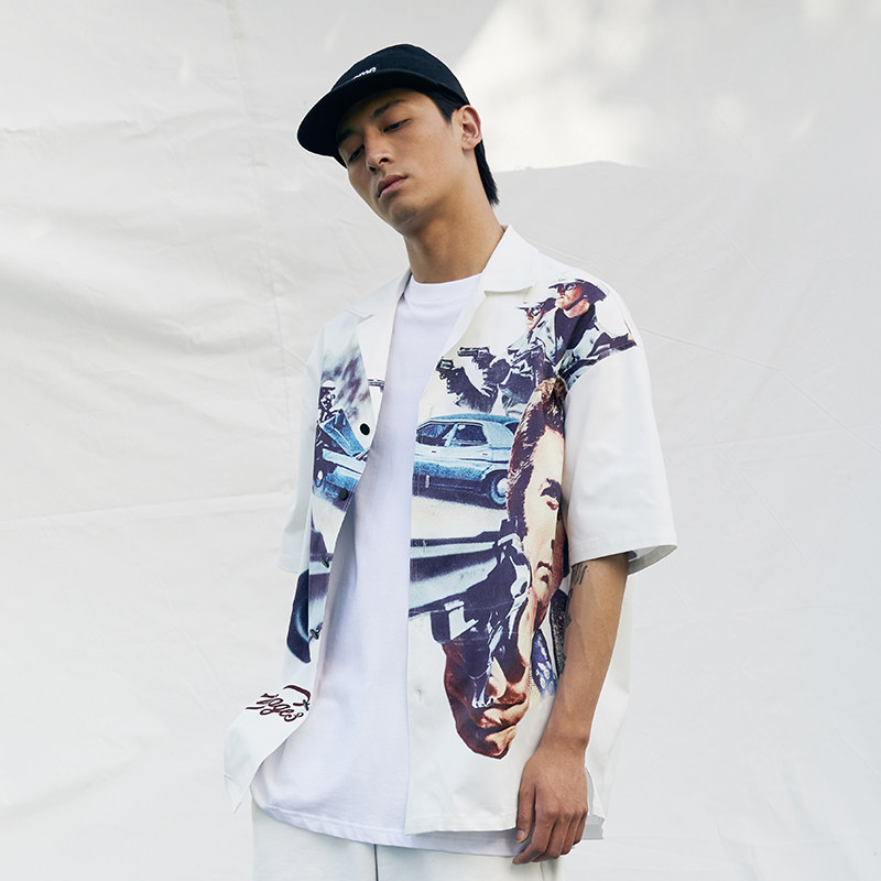 APOGE3夏季休闲复古设计立领电影海报衬衫男后背刺绣LOGO短袖情侣热门设计联盟服务商