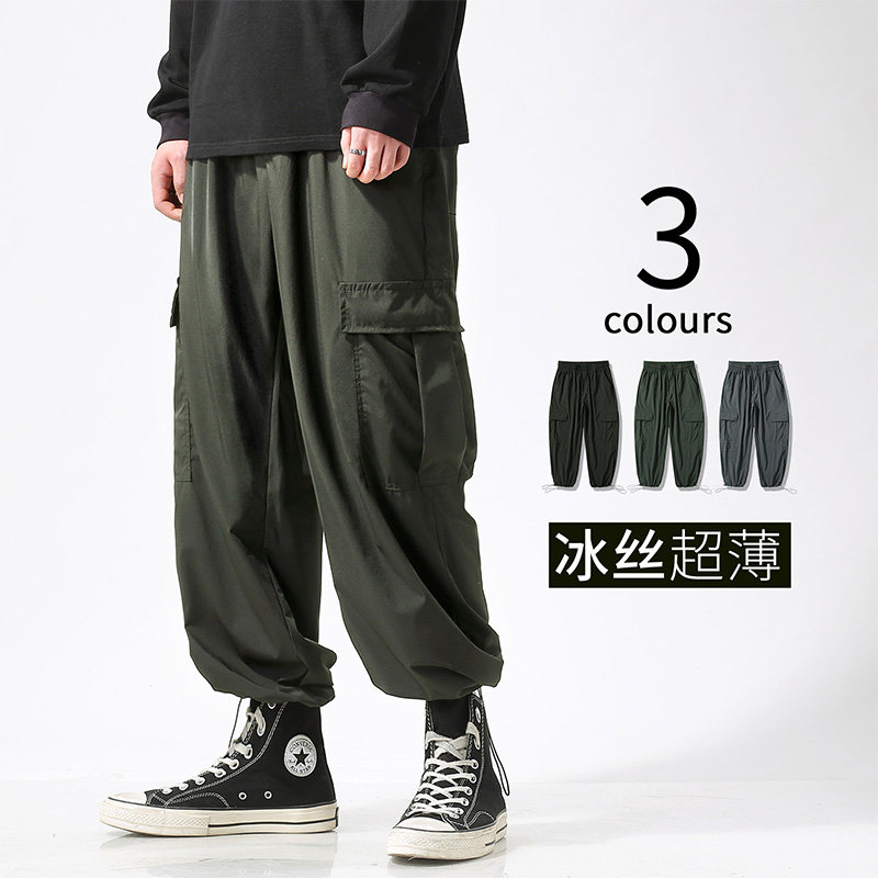 夏季薄款工装裤男抽绳束脚运动宽松直筒休闲加肥加大码冰丝裤子潮热门设计联盟服务商
